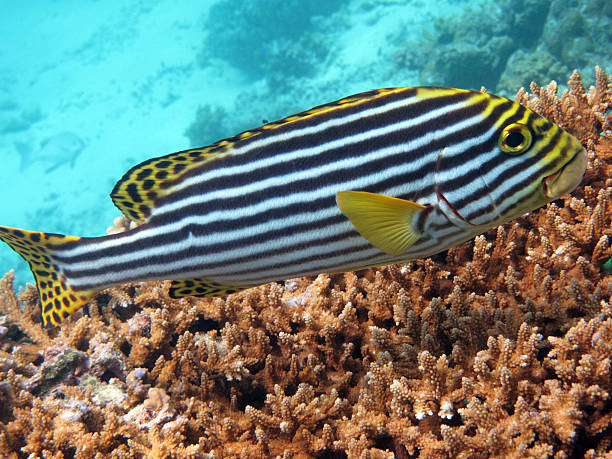 Les gaterins orientaux, ou Plectorhinchus, sont des poissons marins colorés de la famille des Haemulidae. Ils se distinguent par leurs lèvres charnues et leur corps orné de motifs vibrants. Répandus dans les eaux tropicales de l'océan Indien et Pacifique, ces poissons habitent principalement les récifs coralliens et les lagons. Omnivores, ils se nourrissent de petits invertébrés et d'algues, fouillant les sédiments avec leurs lèvres proéminentes. Les gaterins sont généralement paisibles et souvent observés en petits groupes. Leur apparence attrayante et leur comportement intéressant en font des favoris des aquariums marins, bien qu'ils nécessitent des soins spécifiques.